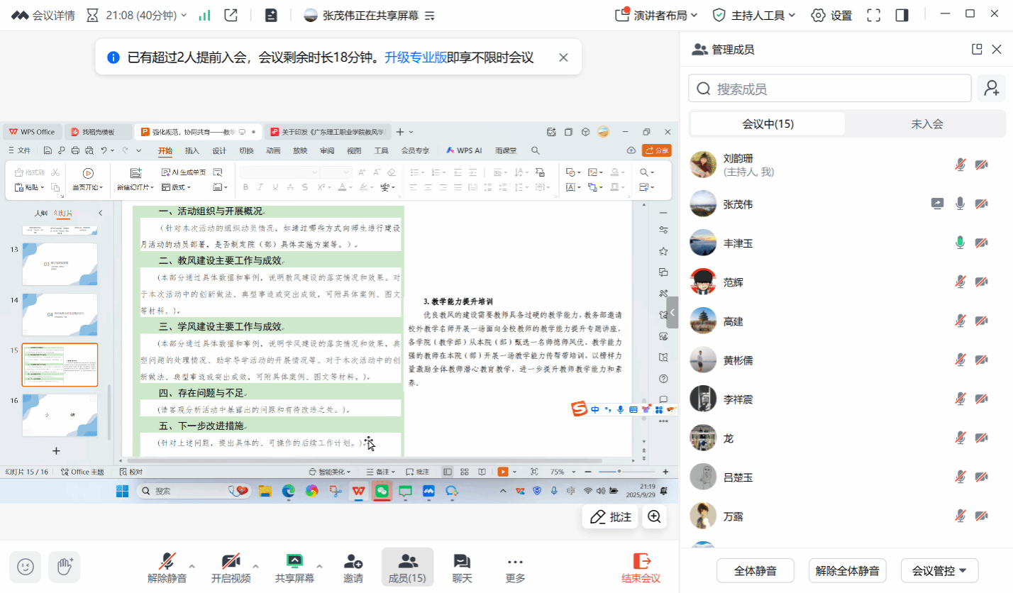 会议紧密围绕《广东理工职业学院教风学风建设月活动实施方案》的推进要求展开,明确了三项核心工作任务,为后续建设工作划定清晰路径:一是各专业需挖掘教风学风建设典型案例,如协同备课、学生竞赛指导(如RC国赛获奖案例)、心理辅导助力学风提升等类型,优先提炼现有成熟做法;二是组织教学能力传帮带培训,推选院内师德优、能力强的教师开展专题分享,可结合AI赋能教学等特色方向设计内容;三是推进助学导学活动,鼓励各专业邀请企业开展讲座,并将企业资源融入课程教学。会议强调,各专业需做好团队分工,及时沟通落实进度,避免教学事故,共同打造协同育人典型。