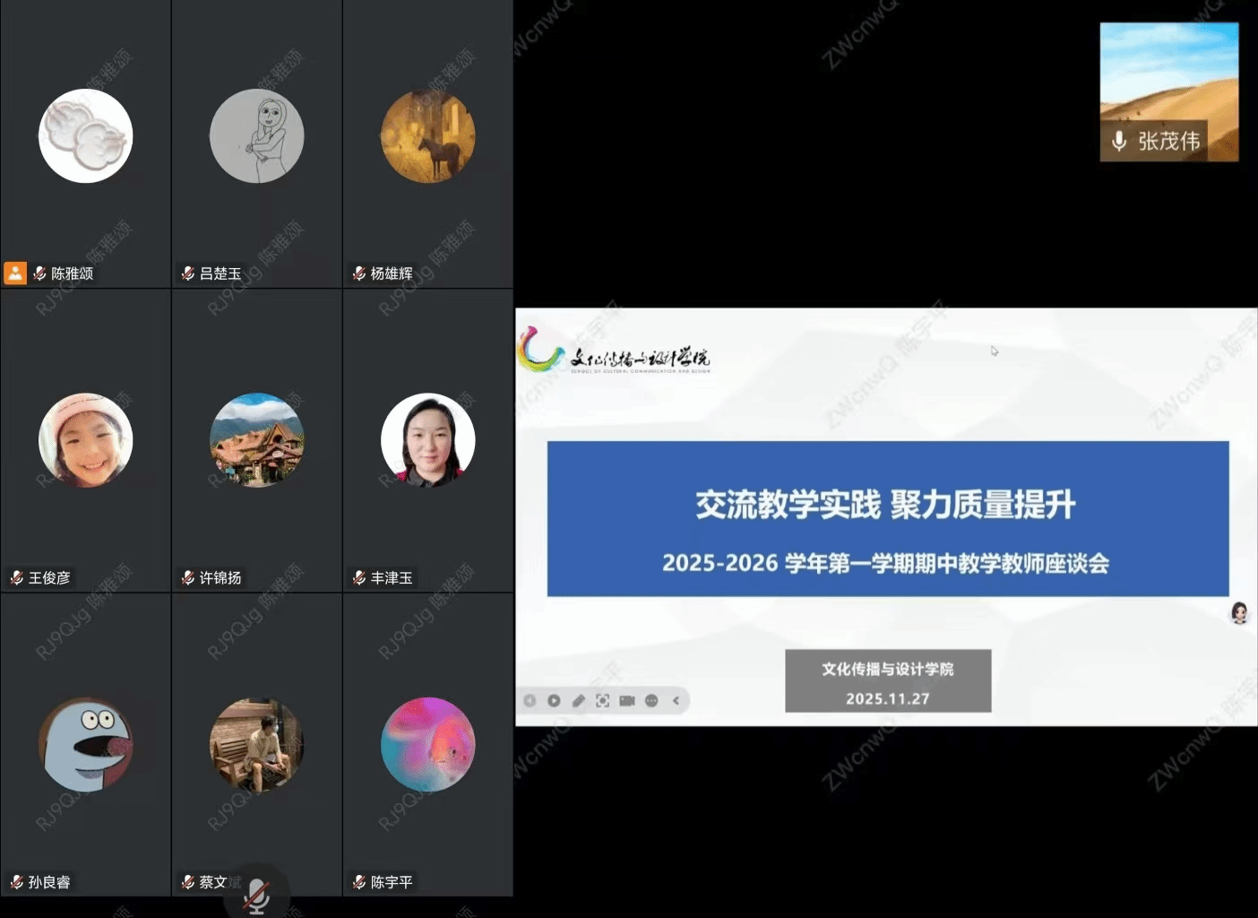 为更好地了解本学期教学情况,解决老师们在实际教学中遇到的困难,11月27日晚,文传学院通过腾讯会议召开了期中教学检查教师座谈会。会议由张茂伟副教授主持,十多位教师代表和教务员参加,大家围绕教学设施、课程安排、教材使用等问题展开了讨论。