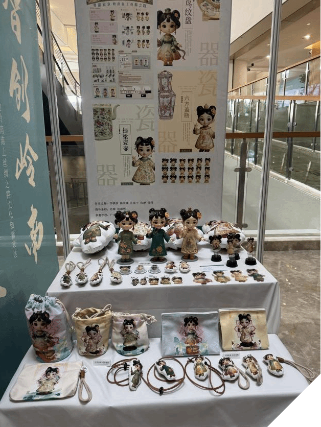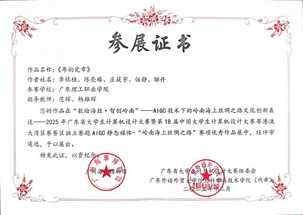 广东理工职业学院文化传播与设计学院动漫制作技术专业学子李镇桂、陈亮臻、庄筱宇、伍静、邬丹,在范辉、杨雄辉两位老师的悉心指导下,精心创作了AIGC作品《粤韵瓷章》。该作品以南粤瓷器为灵感,通过IP设计与文创衍生形式,将传统瓷器文化与现代数字技术巧妙结合,展现了当代大学生在文化传承与创新中的责任与担当。《粤韵瓷章》凭借其独特的创意和精湛的技术,在众多参赛作品中脱颖而出荣获省一等奖,并经评审遴选后入选参展。