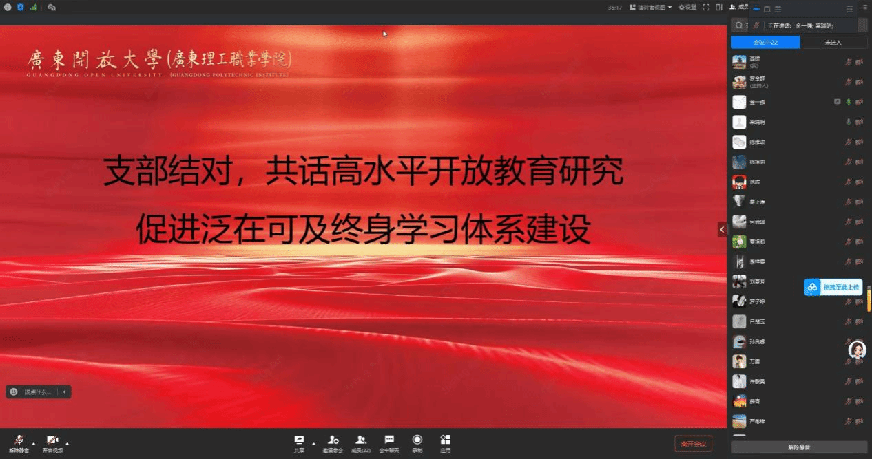 活动伊始,金一强书记介绍了本次共建的初衷,旨在通过党建引领促进教师间论文写作指导、学术研究协作等多方面交流。会上,金一强书记围绕教育强国规划背景与核心内容,解读了规划对开放教育的利好政策,强调广东省将终身学习体系建设列为重大战略课题,计划2027年实现制度突破、2035年建成全生命周期终身教育体系的发展目标。同时,他分析了当前开放教育核心期刊现状与高水平论文产出难点,建议从微观、中观层面加强科研与教学改革,抢抓发展机遇。