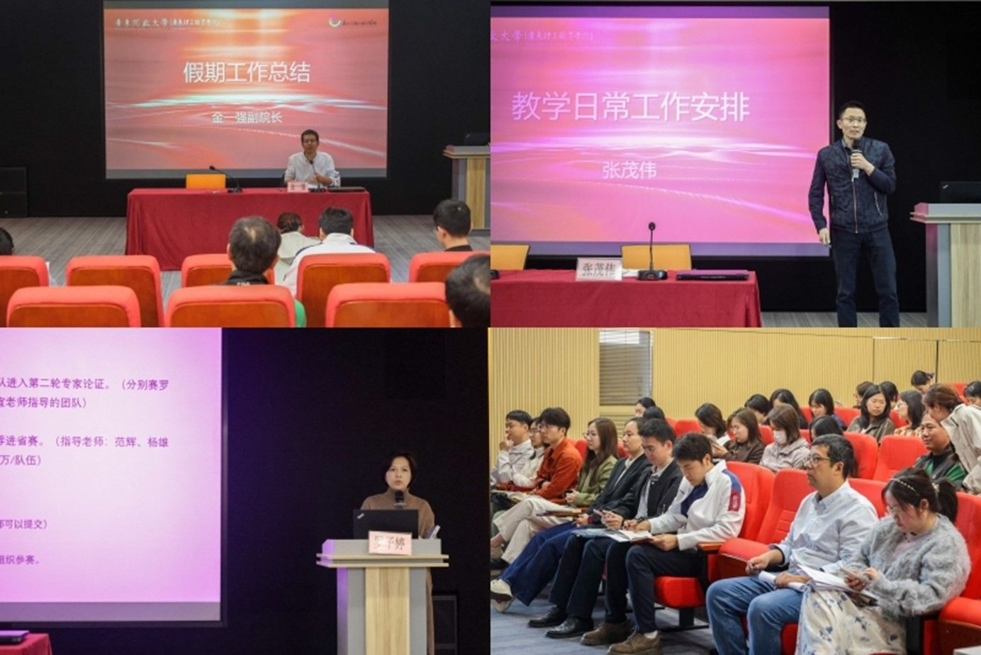 副院长金一强首先作假期工作通报,他肯定了假期学院在办学能力提升、校企合作深化、社会服务践行、学生技能培训、语言文字工作、项目库建设及终身学习体系建设谋划等方面的成效,梳理了存在的不足,明确了改进方向,并强调要延续优良作风,补齐短板、提质增效。