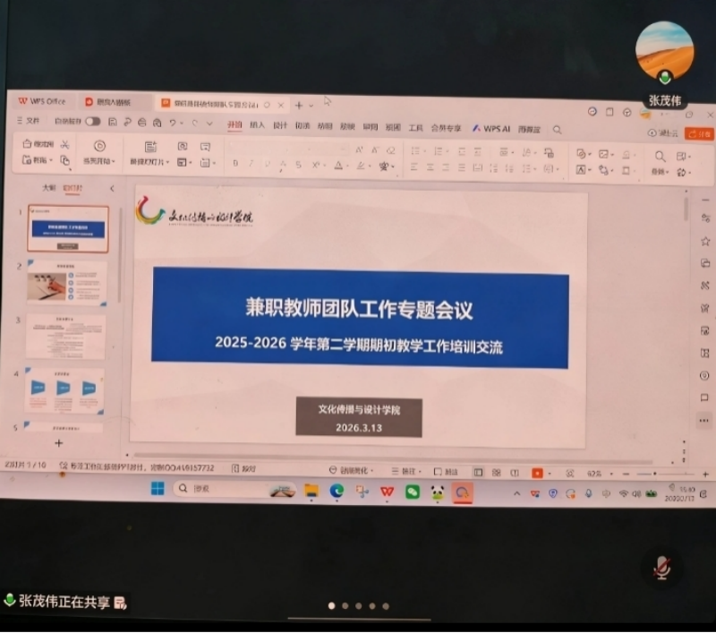 为扎实做好期初教学检查准备,规范外聘教师教学行为,提升课堂教学质量,近日,文化传播与设计学院召开外聘教师新学期教学工作会议。会议由张茂伟副教授主持,全体外聘教师参会。
