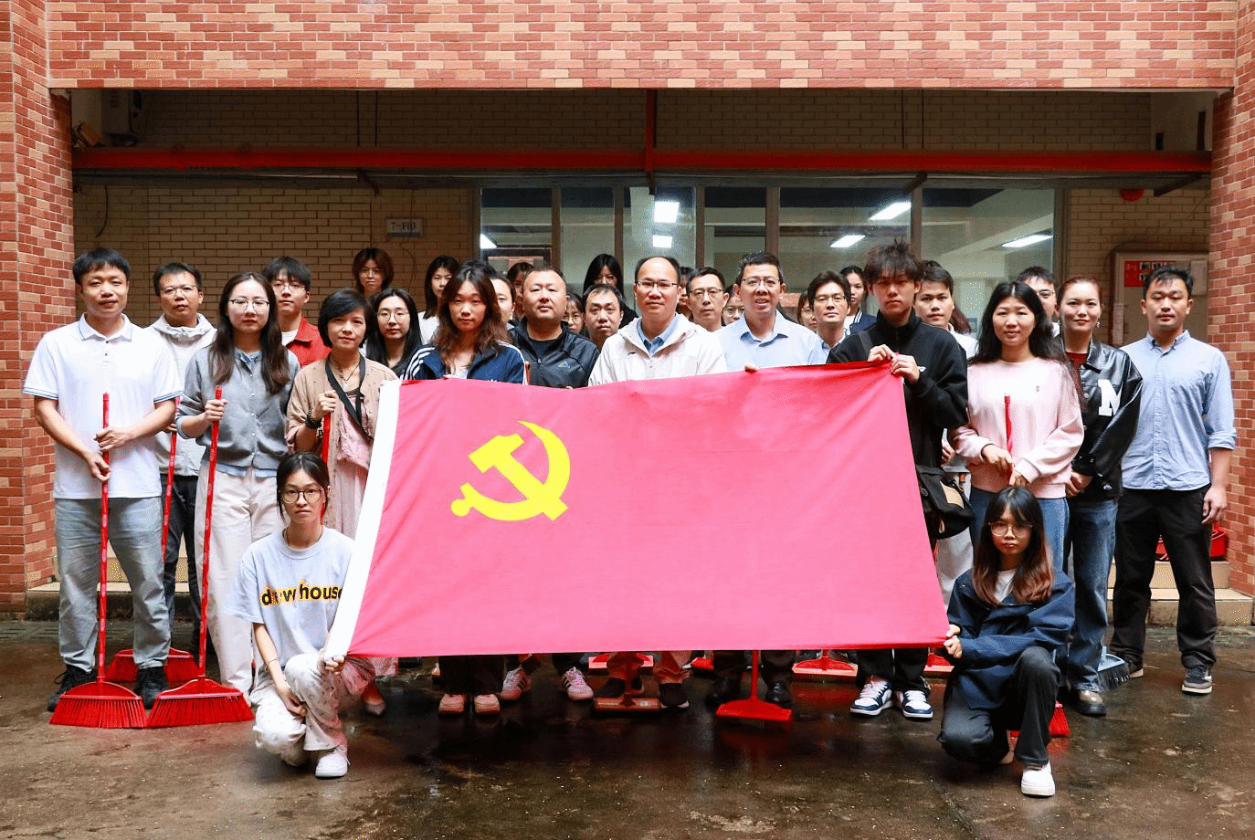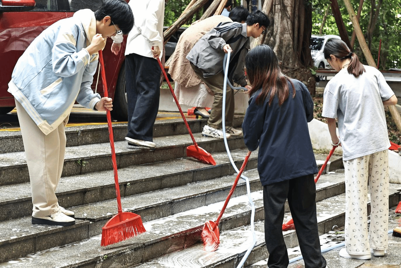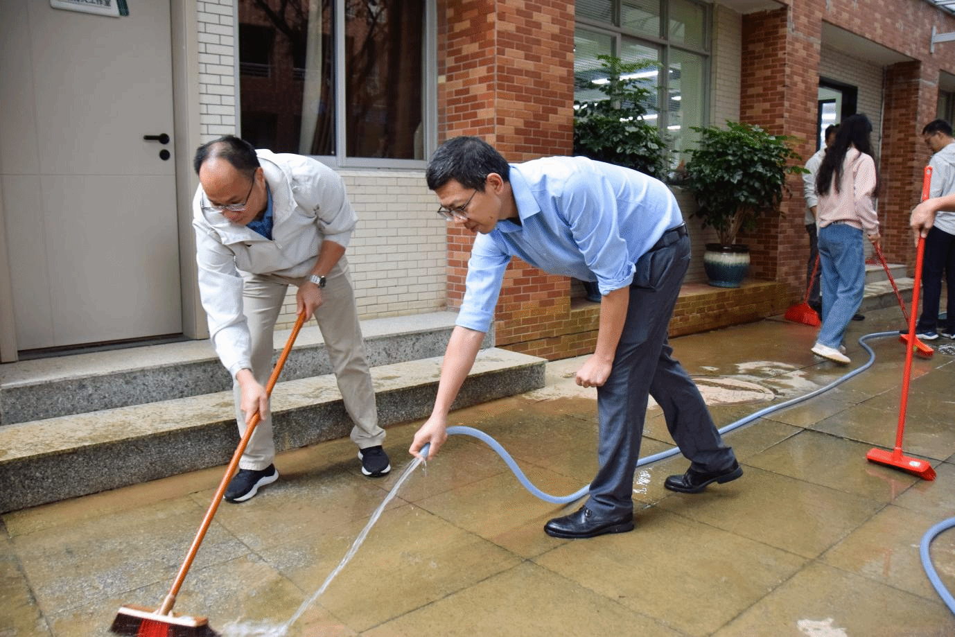 活动中师生协作、干劲十足,形成“党员带头干、师生齐参与”的热烈氛围。保卫部(武装部)党支部对积水处逐一排查安全隐患,筑牢安全基础;后勤基建部党支部用水管等工具冲洗地表淤泥与顽固污渍;文化传播与设计学院学生党支部党员教师及学生代表,使用扫帚等工具清理低洼积水,不留卫生死角。